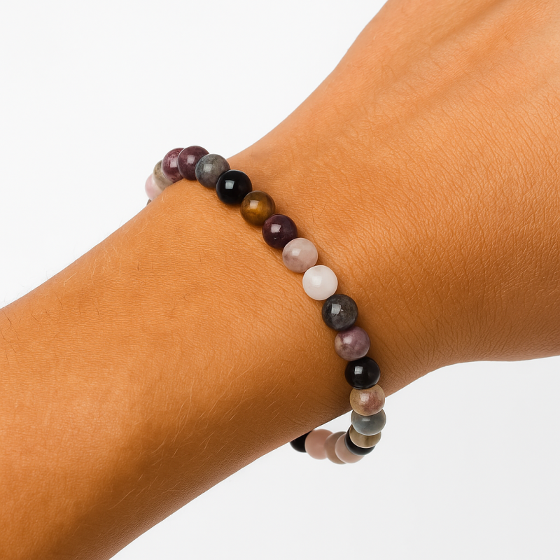 Kleur: Gemengde natuurlijke tinten – roze, groen, zwart, bruin en transparant; elke armband is uniek